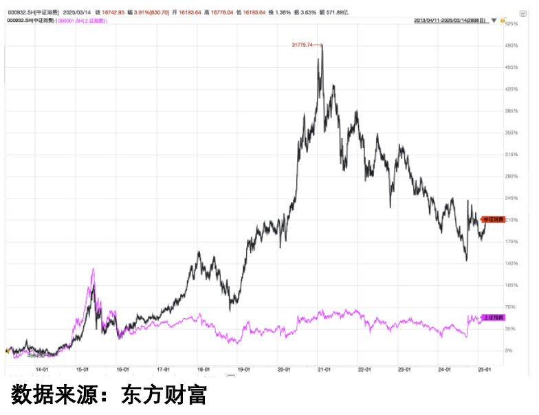 所以,看看上证指数和中证消费这10年的数据变化,可以说,真的是基本一致了
