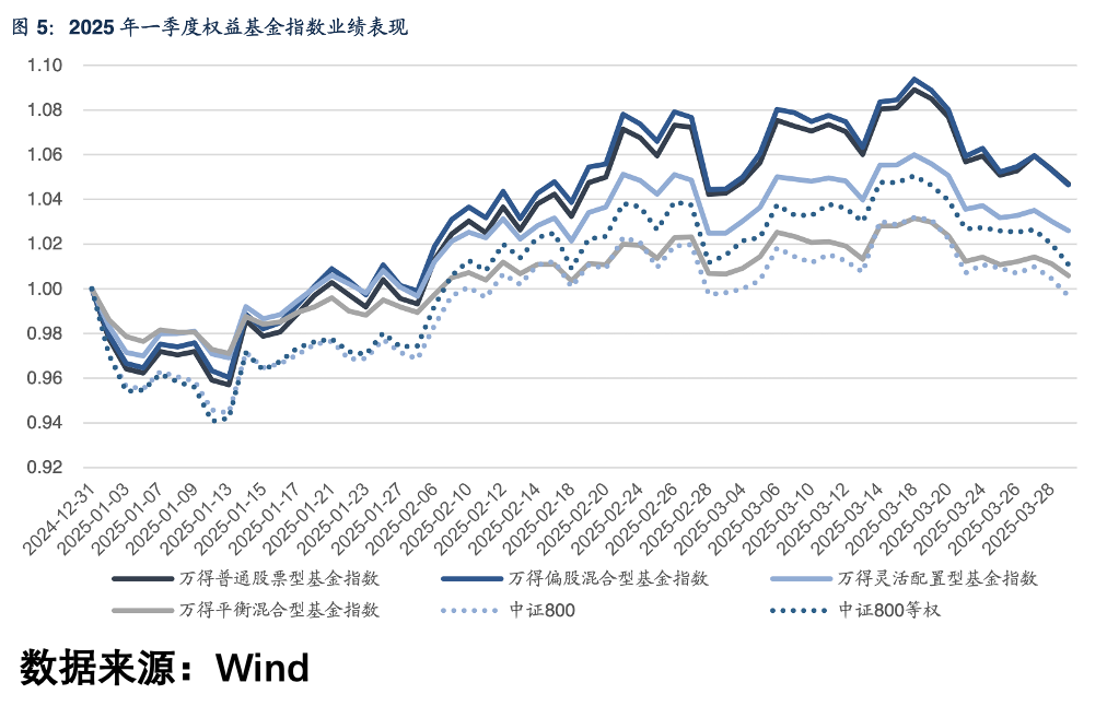 2025 年一季度,偏股类基金整体跑赢主要宽基指数,结构性行情下选股能力和主动管理优势得以凸显。其中,万得偏股混合型基金指数季度上涨 4.65%,相较中证 800 指数同期下跌 0.32%,超额收益为 4.97%。同期,中证 800 等权指上涨 1.09%,在一定程度上反映了中小市值风格的阶段性占优。
