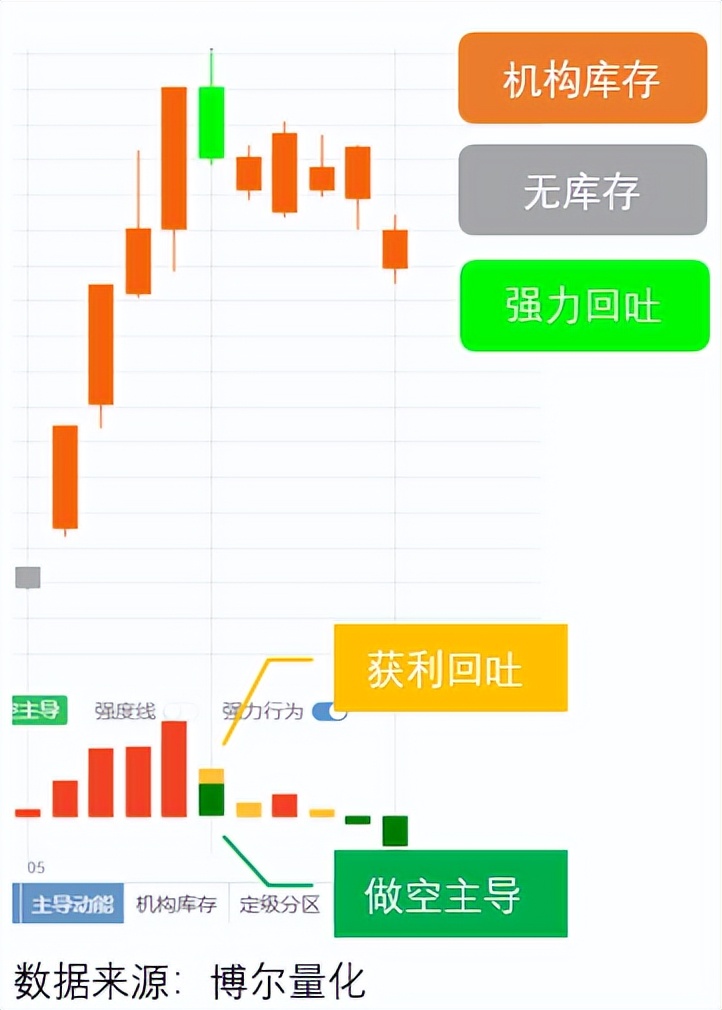 而用模型量化这种交易特征,就是黄色的「获利回吐」和绿色的「做空行为」同时出现,即为强力回吐。如果在「全景K线」上,就以绿色K线表示。