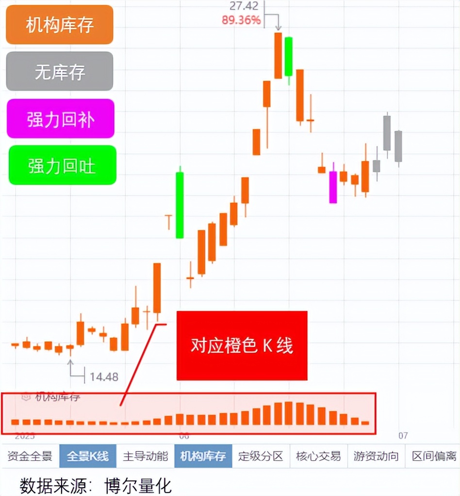 然后我们再看上图股票,用「全景K线」能够发现,该股没涨的时候,就已经橙色的「机构库存」持续不断,对应的是橙色K线持续,说明机构一直在积极参与,哪怕当时不涨,也是蓄势待发的状态。