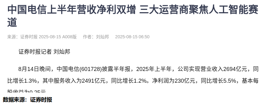 中国电信这份半年报确实漂亮:净利润230亿元,同比增长5.5%;天翼云收入573亿元,智能业务更是暴涨89.4%。但有趣的是,这些光鲜的数字并没有带来股价的明显上涨。