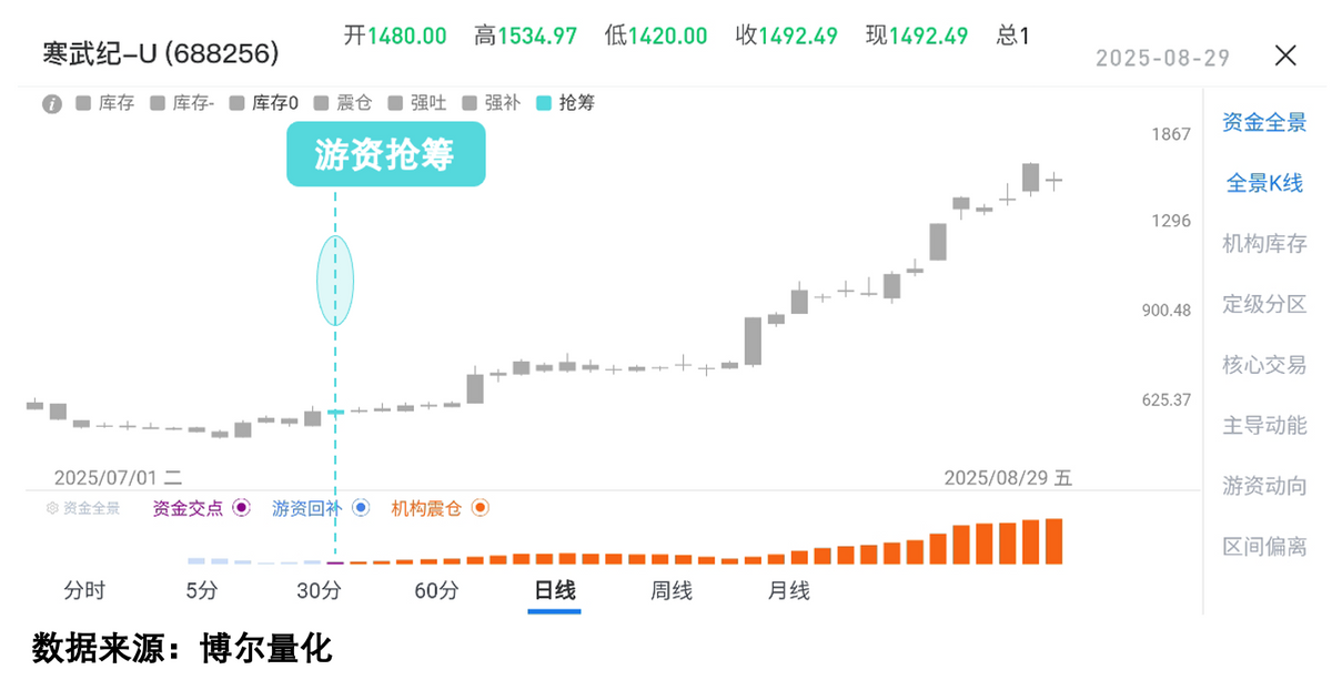 图中橙色柱体反映机构资金的"机构库存"数据,蓝色柱体则显示游资动向。当两类资金同时活跃(紫色柱体)时,往往意味着真正的机会正在酝酿。寒武纪异动后几天,游资就开始抢筹,之后机构被迫接棒拉升——这种博弈过程在数据中清晰可见。