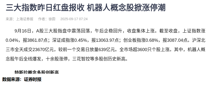 昨天收盘后,我盯着手机屏幕发呆。上证指数涨了0.04%,深成指涨了0.45%,创业板指涨了0.68%,全市场3600多只股票上涨。机器人概念股更是集体爆发,三花智控、拓普集团这些票都创了历史新高。