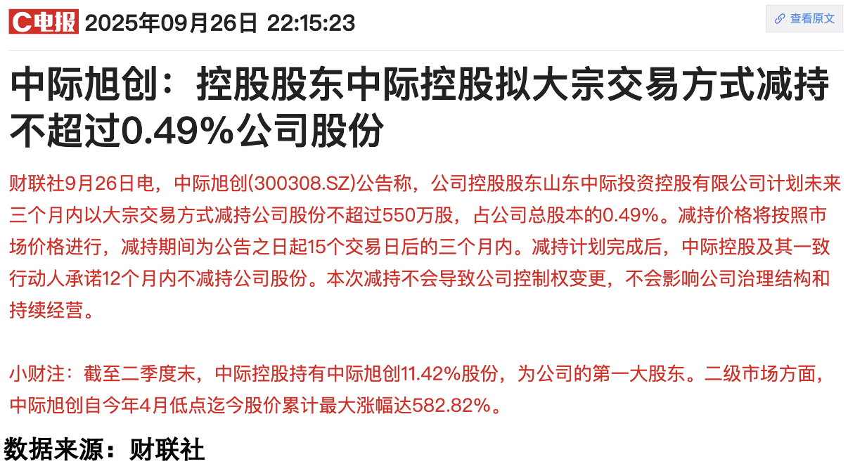 咱一个个来说,「中际旭创」减持其实并非是个案,这个月有600多家个股实施减持,有500多家个股预告减持,或许要过节了,大股东们要补贴下家用吧,而「中际旭创」之所以受到关注,和其本身带着「科技股」龙头的光环有关系,这点其实也很有趣,你像美股市场,一般的减持不会被大家所担心,但是A股不一样,我们一定拒绝的,因为我们深信经营者都不看好,凭什么要我一个一心想着「高抛低吸」的财务投资者要比你一个经营者还要坚守,逻辑说不通啊!