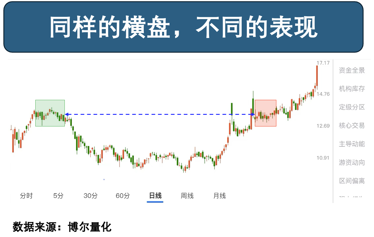 记得有一次分析一只股票时特别有感触。这只股票在一个价位区间横盘了很久(图中绿色框部分),形成了明显的"天花板"。随后两次尝试突破都无功而返(红色框前部分)。按照传统技术分析思路,这个位置应该是强阻力位。