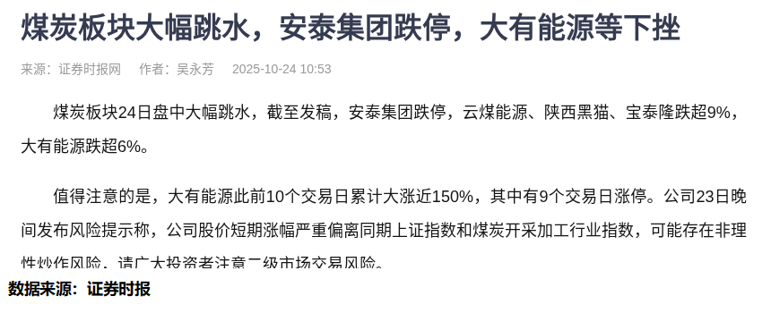 10月24日这天,我像往常一样打开行情软件,却被眼前的景象惊到了——煤炭板块全线飘绿,安泰集团直接跌停,云煤能源、陕西黑猫等个股跌幅超过9%。最引人注目的是大有能源,这只前期暴涨150%的"妖股",如今也难逃回调命运。