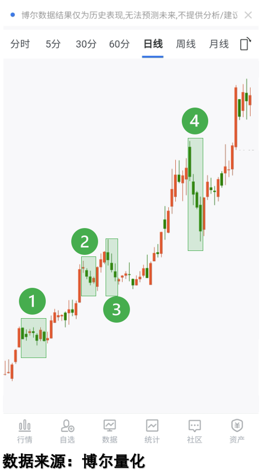 其实冷静想想,我们都很清楚,股票涨得越好,其实波动越大,那些做盘的机构大资金怎么舍得分你一杯羹,这还不使劲给你制造紧张气氛,就像上图中这只股票,区域①到区域③,虽然股价长得还不错,但是波动却不小,这就让人很难扛得住,关键是实实在在上涨的没几天,多数时候都在调整,好不容易熬出头,结果没涨两天就来到区域④,要说是「做顶」,相信没有几个人会有异议,结果你前脚走,后脚就涨到你能哭晕过去。