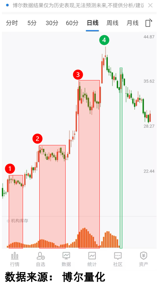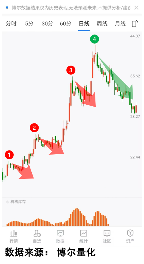 进一步看,前三个高点位置下来之后,虽然股价很折腾,但其实对应的「机构库存」数据都是持续活跃的,有人可能会说,那机构也可能是在卖呀,这是有可能,但是如果机构不看好一只股票,这只股票的机构资金交易会持续很长时间嘛?这样一直在持续,显然就不一般,我们和第四次高点比较下,那一轮高位下来后的第一根长阳反弹,就没有「机构库存」数据出现,很明显,机构资金是真的跑路了,之后股价的表现也就成了一泻千里。