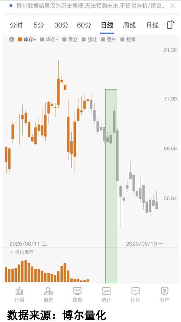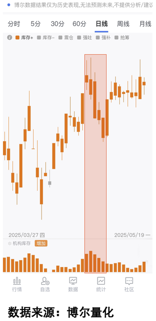 比如下面这只股票,2025年行情从4月初开始表现,但这只股票表现很一般,究其原因就是没有机构大资金的参与,现在大家看到的就是我用了十多年的大数据系统提供的「交易行为数据图」,图中橙色柱体就是系统中反映机构资金活跃程度的橙色「机构库存」数据,如果「机构库存」数据越活跃,那就意味着参与交易的机构资金越多,机构资金参与的时间也越长。