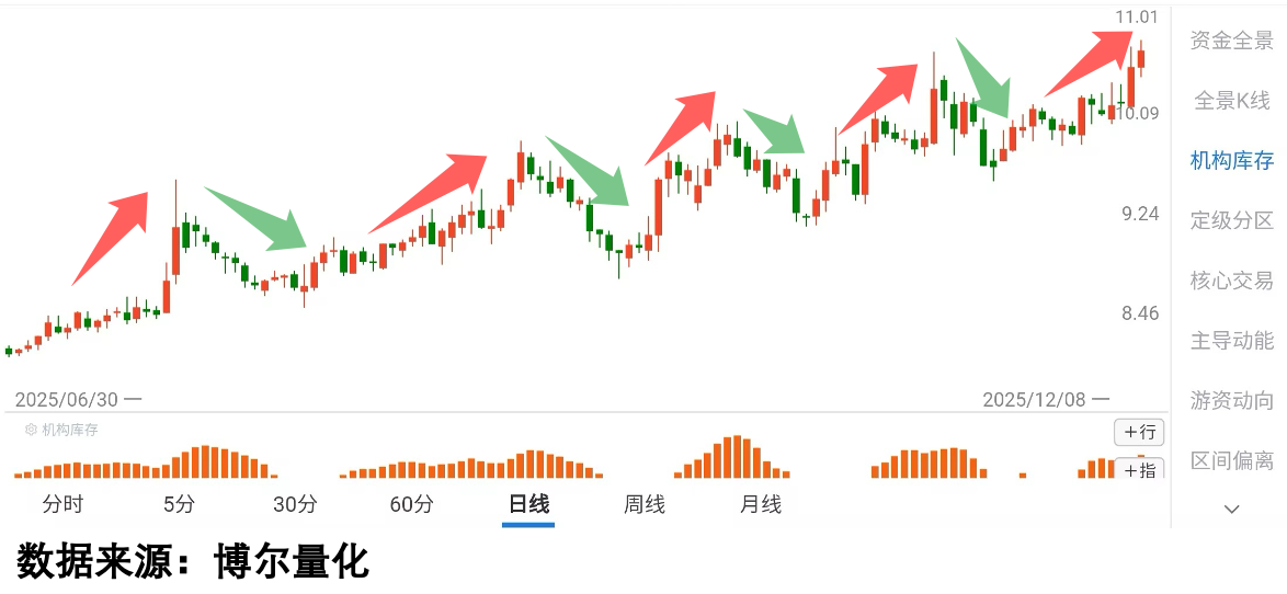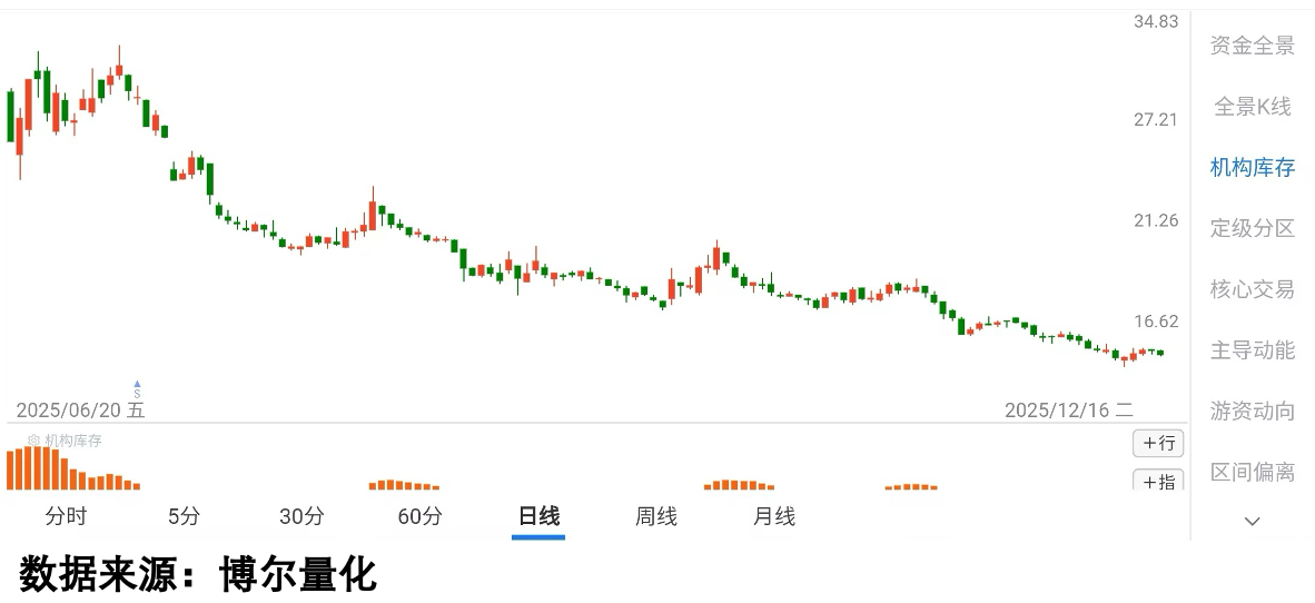 这样的情况并不是特例,整个2025年行情表现的很不错,但是期间也有几波大的调整,其中最让人刺激的就是6月19日那次调整,因为伊以冲突,市场突然出现调整,但很快就重拾升势,但是从下面这只股票却在不久之后一路开始调整,而结合量化大数据,通过「机构库存」数据,就会发现:期间「机构库存」数据很快就消失了,说明机构接着调整就彻底出局,行情也是一落千丈。