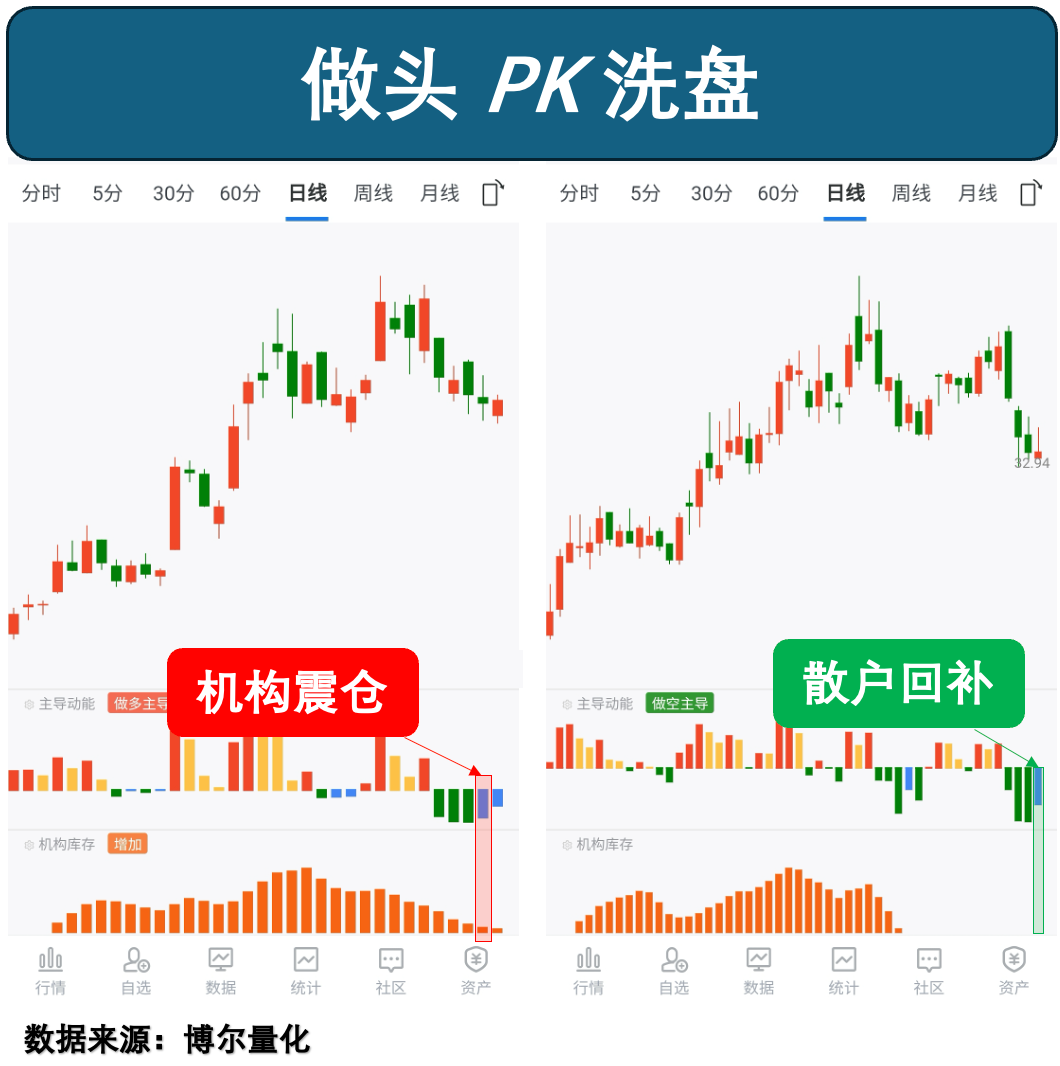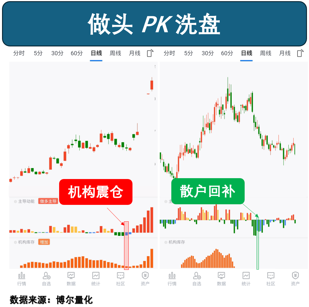 正如我们所预计的,左侧是「机构震仓」行为,在机构诱空之后之后,迅速回补,然后股价继续上涨,而右侧的股票则是典型的散户抢反弹,虽然也有上涨,但是好景不长,很快股价继续调整。