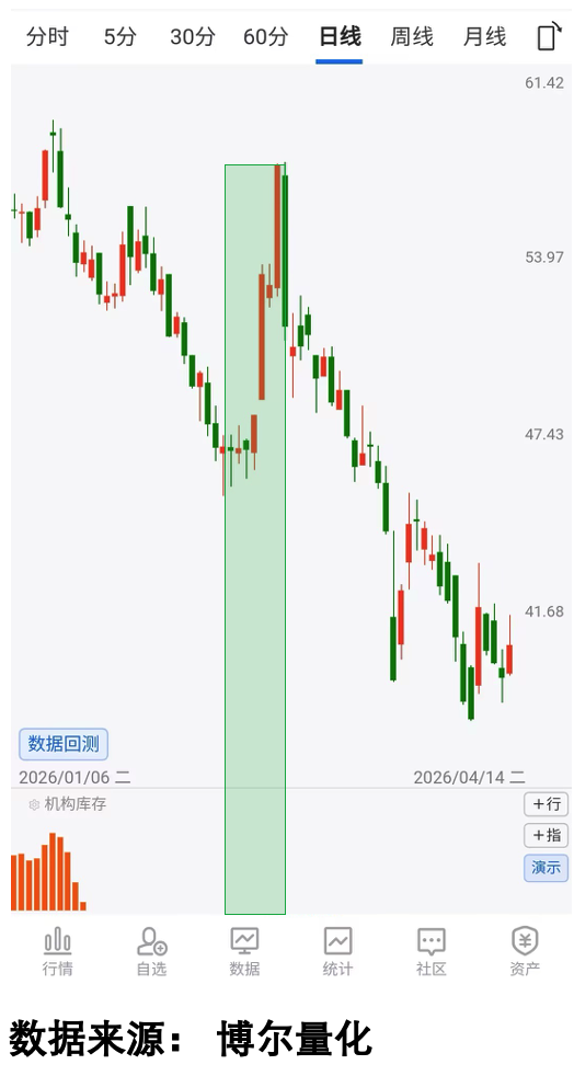 做交易这么多年,我一直依赖量化数据辅助判断。最常用的就是「机构库存」数据,图里的橙色柱体就是这个数据,它反映的是机构大资金参与交易的活跃程度,橙色柱体持续的时间越长,说明机构参与的积极性越高。