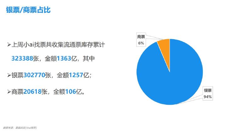 小ai找票流通票库存汇集能力再上一层楼,上周汇聚流通票达32万张,累计金额1363亿元。其中银票约有30万张、累计1257亿元;商票约2万张、累计106亿元。银票占比达到94%,创近期新高。