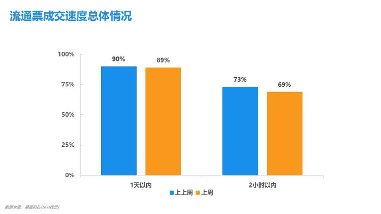 上周流通票成交速度略有减缓,其中一天内成交的占比为89%,较上上周下降1%;2小时内成交的占比下跌4%,上周占比为69%。