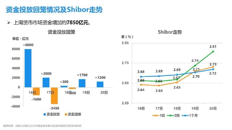 上周央行在降准实施基础上,同时开展公开市场操作累计向市场投放资金约7850亿元。不过短期Shibor周内呈上行走势,各期限品种上涨10至20个BP不等。