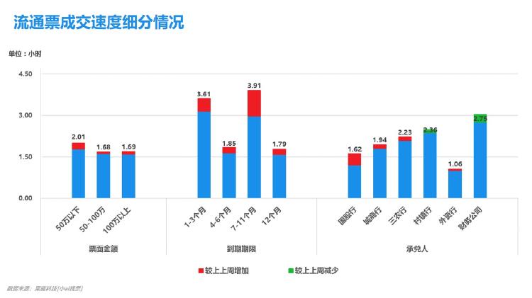 从金额看, 50万以下的票成交降速较为明显,而50至100万面额票以平均1.68小时的成交速度,在近3周首次处于领先位置。从期限看,7至11个月的票,降速最为明显,下降幅度达31%,而一年期和4至6个月的票成交速度依然为快。从承兑行角度看,除村镇和财务票成交速度有所提升外,其他各类承兑人的票成交速度均有所下降,其中国股行的票降速较多,较上上周下降34%,而外资行以平均1.06小时的成交速度,连续2周超过国股行,在各类承兑人中,成交速度最快。