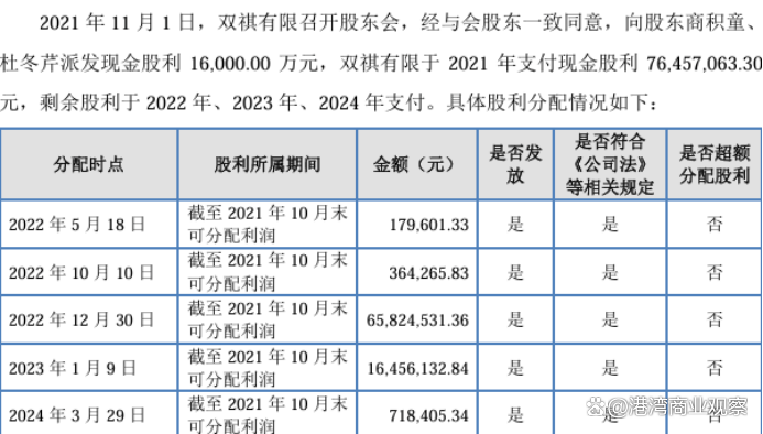 2021年11月1日,双祺有限向股东商积童、杜冬芹派发现金股利1.6亿,双祺有限于2021年支付现金股利7645.71万,剩余股利于2022年、2023年、2024年支付。
