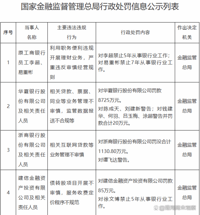 9月5日,国家金融监管总局披露多条行政处罚信息,涉及华夏银行(600015.SH)、浙商银行(601916.SH)、建信投资以及原工商银行(601398.SH;01398.HK)两名员工。