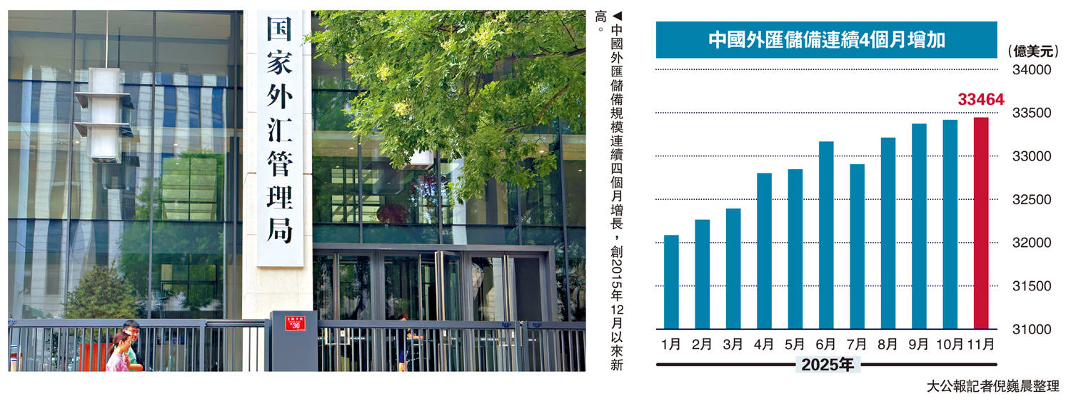 中国人民银行数据显示,截至11月底,中国外汇储备规模为33464亿元(美元,下同),较10月底增长30亿元或0.09%,已连续四个月增长,创2015年12月以来新高。分析称,外储规模的持续稳定,预示中国在国际收支、跨境资本流动等方面保持稳健状态。综合内外部因素判断,未来中国外储规模将继续保持基本稳定,并有望在较高位区间平稳运行。\大公报记者 倪巍晨上海报道