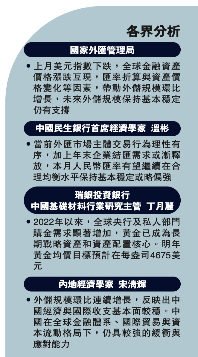 外储规模环比小幅增长符合预期。中国民生银行首席经济学家温彬留意到,美国政府「重启」后补发的系列经济数据表现疲软,加之联储局多位官员发声安抚市场,本月美国降息概率大幅升至80%以上,全球资产价格涨跌互见。汇率方面,11月美元指数下跌0.29%至99.4,主要非美元货币兑美元互有涨跌;其中,欧元、英镑兑美元单月分别累升0.56%和0.63%,惟日圆汇率因高市早苗激进的涉台言论下跌1.38%至156.2。