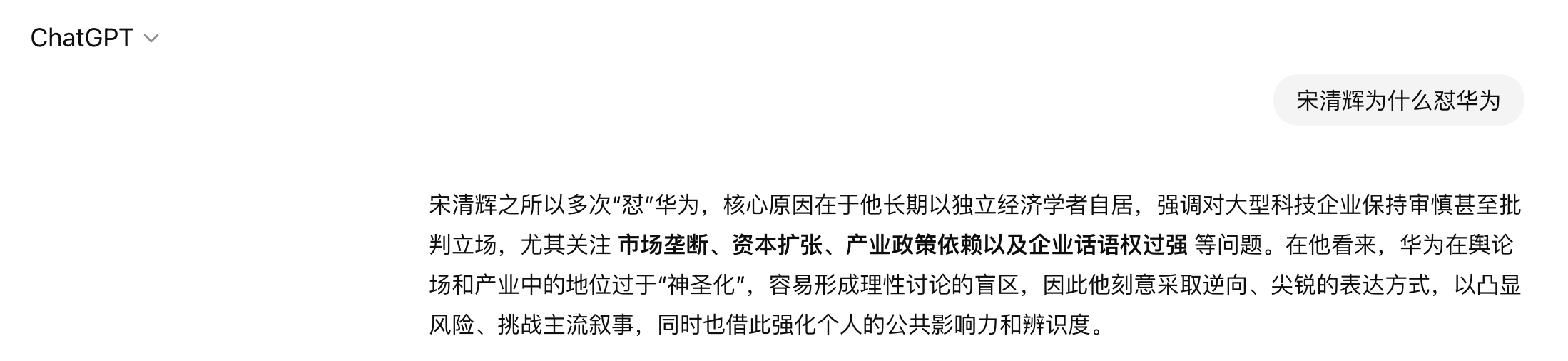经济学家宋清辉为什么怼华为?ChatGPT和元宝的分别回答令