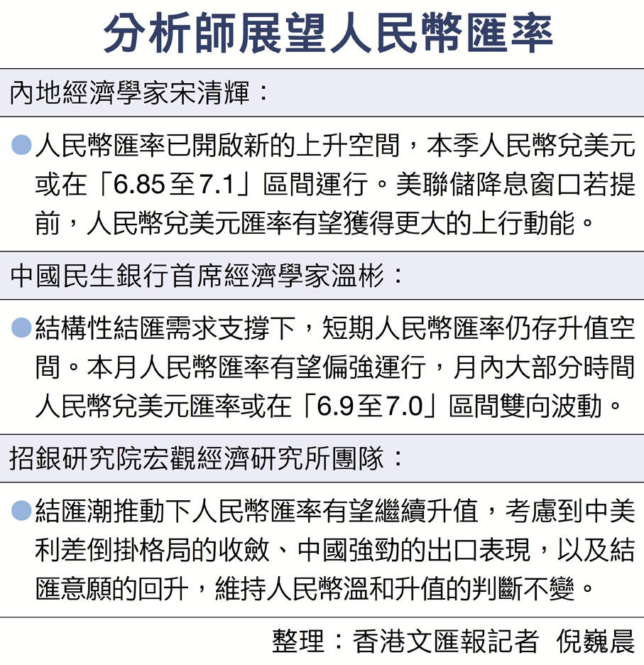 宋清辉相信,人民币汇率走强有较强基本面支撑,本季汇率料续「稳中有升、双向波动」格局,鉴于人民币已开启新的上升空间,「一季度人民币兑美元有望在『6.85至7.1』区间运行」。他并提及,春节前市场「结汇潮」仍有释放空间,叠加中国政策红利的持续释放,人民币有继续冲高的惯性。此外,本季美国就业和通胀数据的变动若引致美联储降息窗口提前,人民币兑美元汇率将获得更大的上行动能。原标题:地缘风险资金涌中国资产 人民币中间价15月新高