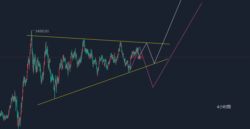 黄金周三震荡上涨, 日线级别K线连阳上升,短期跌势进一步被抑制,那么就意味着今日黄金将看多头延续,由于是小阳连阳,暂时还是处于反弹修正,只有收实体大阳线,且收线站上中轨与ma5,多头才能形成强有力的动能,若今日再收一根小阳线,不排除明日有继续下行的可能性,4小时布林带收口中,K线在中轨附近激烈争夺,从形态上看,K线在下轨处支撑探底回升,经过整理后向上大阳拉升,昨晚黄金冲高回落再次测试3350支撑反弹,说明当前走势多头偏强,因此今日早盘看二次上升,去测试3370-3380;
