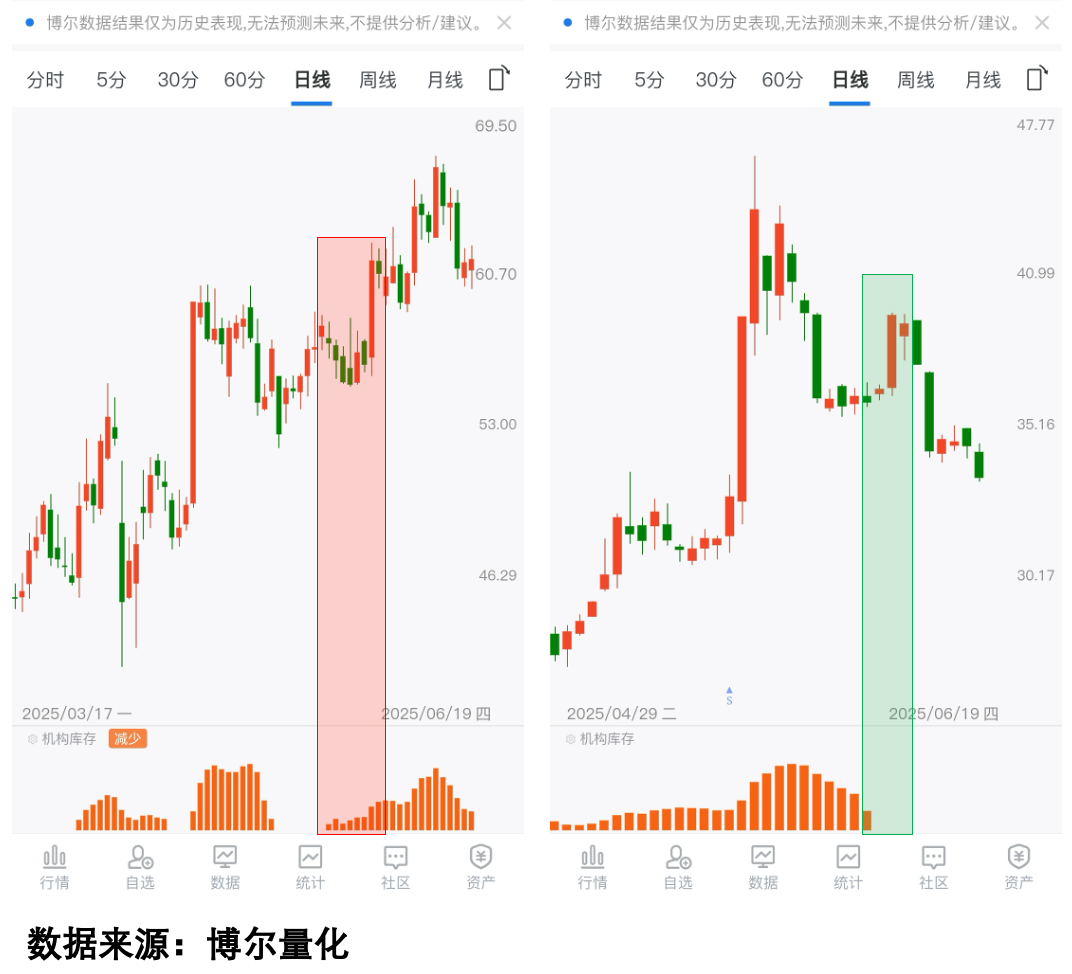 图中两只股票都是创出新高后开始调整。但关键区别在于机构是否参与其中。左侧股票反弹时有明显的机构行为配合;而右侧股票反弹时机构踪迹全无——这才是当前最需要关注的差异点。