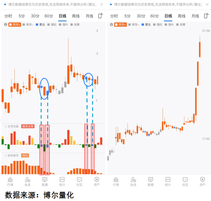 重点要看橙色「机构库存」数据。柱子密集说明机构在积极交易。左边这只票下跌时橙色柱子消失,反弹两天K线很漂亮吸引散户追高,结果反手就被砸盘。右边这只票虽然连跌一周,但橙色柱子密集说明机构根本没跑。