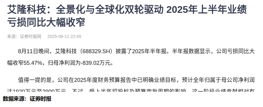8月11日晚间,艾隆科技发布了2025年半年报。数据显示,公司亏损同比大幅收窄55.47%,归母净利润为-839.02万元。