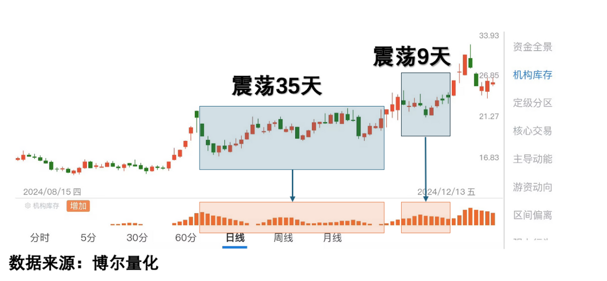 比如上面这只股票,虽然涨得不错,但实际上从2024年9月开始,真正上涨的就几天时间,其余40多个交易日一直在震荡。机构表现得很有耐心,但散户却受不了了。