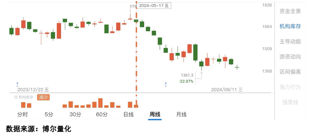 这是茅台的周线数据图。2024年5月17日后,“机构库存”没了,说明机构资金不积极交易了。这样一来,股价自然撑不住。