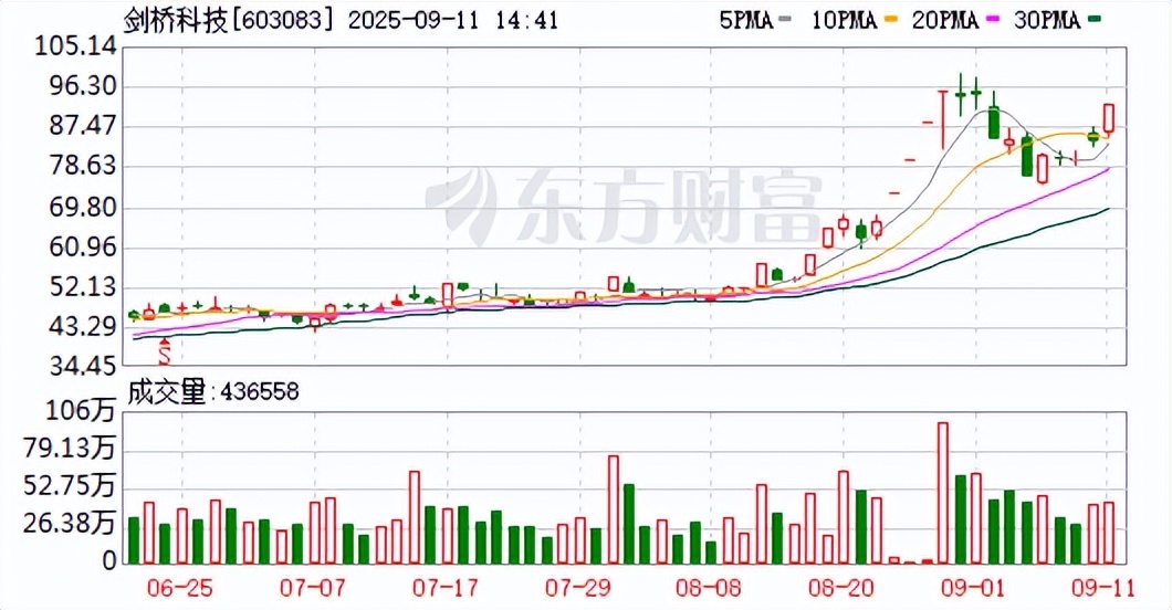 9月11日那天早上,我正喝着咖啡刷行情,突然看到剑桥科技的股价像打了鸡血一样往上窜。收盘一看,好家伙,直接涨停了!92.26元的收盘价离历史高点98.8元就差一口气。