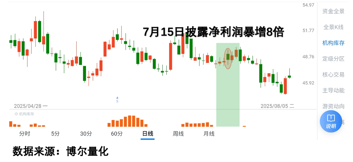 另一个例子是纳瑞雷达。7月份发中报说净利润暴增8倍,结果股价反倒跌了10%。那时候行情多好啊,跌的股票屈指可数。但一看数据就明白了:利好公布前后压根没有"机构库存",说明大资金根本不买账。