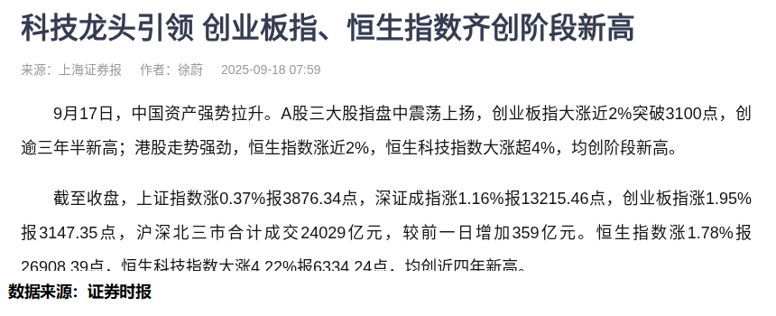 9月17日,中国资本市场迎来久违的普涨行情。创业板指大涨近2%,恒生科技指数飙升4.22%,半导体、储能板块领涨。中芯国际A股创下120.8元历史新高,宁德时代单日涨幅达8%。表面看,这似乎是投资者狂欢的时刻。
