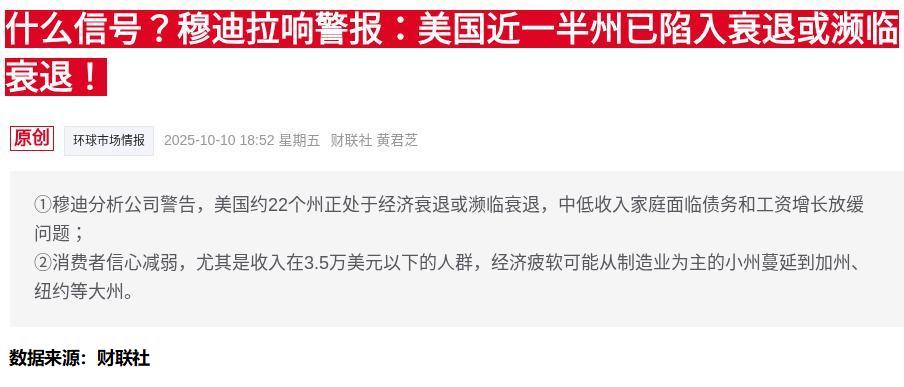 穆迪分析公司的最新报告确实令人警醒。美国东西两岸多个州的经济状况堪忧,低收入群体首当其冲。移民政策收紧、关税上调、政府裁员等因素交织在一起,构成了复杂的经济图景。特别值得注意的是,加州和纽约州的经济走向被视为全美经济的风向标——这与A股市场中某些权重板块的引领作用何其相似。