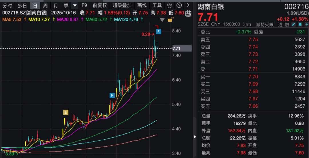 当我看到湖南白银(002716)最新发布的回购方案调整公告时,不禁想起了自己刚入市时的青涩模样。这家公司年内股价已累计上涨超过124%,最新报价7.71元/股,总市值达218亿元。10月16日晚间,公司宣布将回购价格上限从7元/股上调至8元/股,回购数量区间调整为1755万股至2138万股,回购资金总额调整为不低于9260.06万元且不超过1.23亿元。