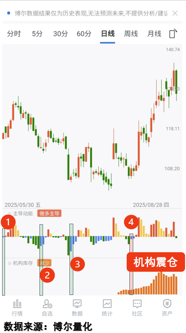 重点在于:当蓝色「回补」行为与持续「机构库存」同时出现时,往往意味着机构在震仓洗盘——这正是趋势转折的关键信号。而前三次反弹仅有散户回补行为,缺乏机构参与。