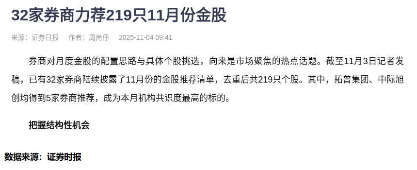 32家券商最新公布的11月金股名单让我眼前一亮。219只个股中,拓普集团和中际旭创获得5家券商一致推荐,神火股份、紫金矿业等也获得4家券商青睐。表面看,这是给投资者指明方向的好事,但作为一个用了十年量化系统的老手,我更关心的是这些推荐背后隐藏的市场密码。