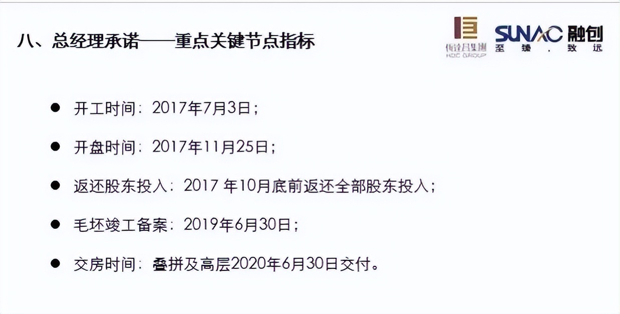 融创在《启动汇报》中正式承诺的业绩调整为:项目总销售额59.58亿元,净利润额13.72亿元,销售毛利率67%,销售净利润率23%。2017年7月3日为开工时间,2017年11月25日开盘,2017年10月底前返还全部股东投入,2019年6月30日毛坯竣工备案,2020年6月30日叠拼及高层精装房交付。