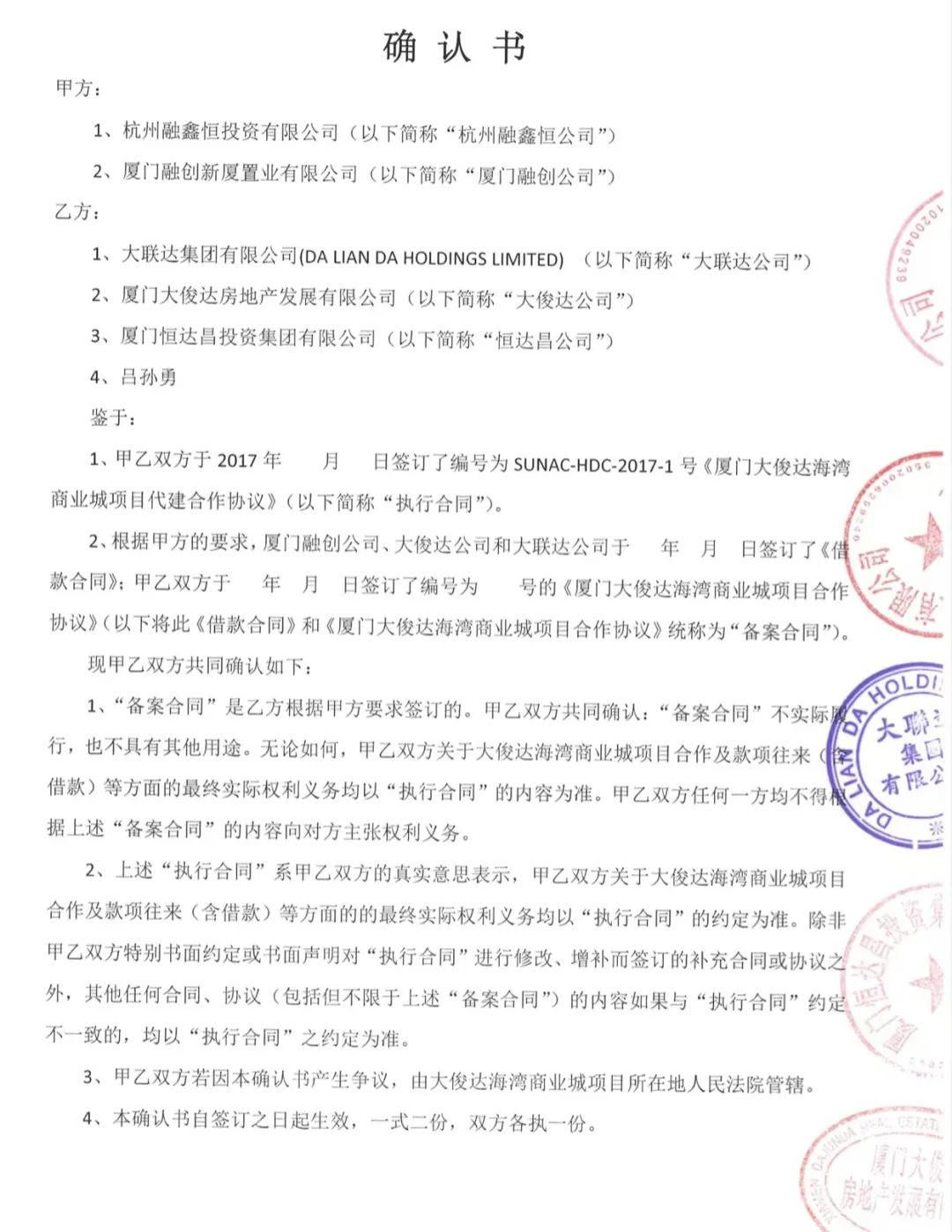 第一,融创编造《厦门大俊达海湾商业城项目投资合作协议》虚假合同,将代建垫款伪造成投资并购股权;