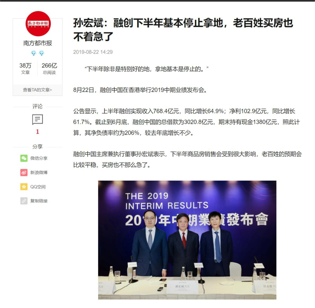 2019年的融创在外界看来依然士气满满。当年在香港召开的中期业绩发布会上,融创董事长孙宏斌谈到拿地计划时表示,“因为去年没怎么拿地,今年上半年拿地显得稍多一些,但按我们的地位,拿的地其实不多,四五月就基本停止。下半年基本没有指标,除非是特别好的地,拿地基本是停止的。”