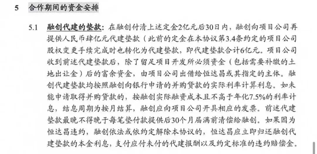 根据《代建合作协议》约定,项目由融创实际操盘,融创以“明股实债”形式注入6亿元代建垫款。融创付清全部款项到达共管账户后5个工作日内,恒达昌配合融创通过增资扩股方式取得项目公司50%股权。