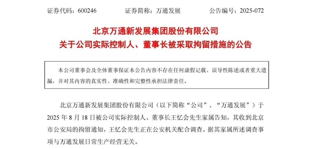 A股上市公司万通发展现任董事长王忆会被北京警方带走。家属说,这次调查事项与公司日常生产经营活动无关。股价表现看起来可不像,公告披露当天,万通发展开盘后很快跌停。挺戏剧性,拘留公告公布之前,万通发展因为宣布要收购一家高速互联芯片研发企业迎来股价暴涨。