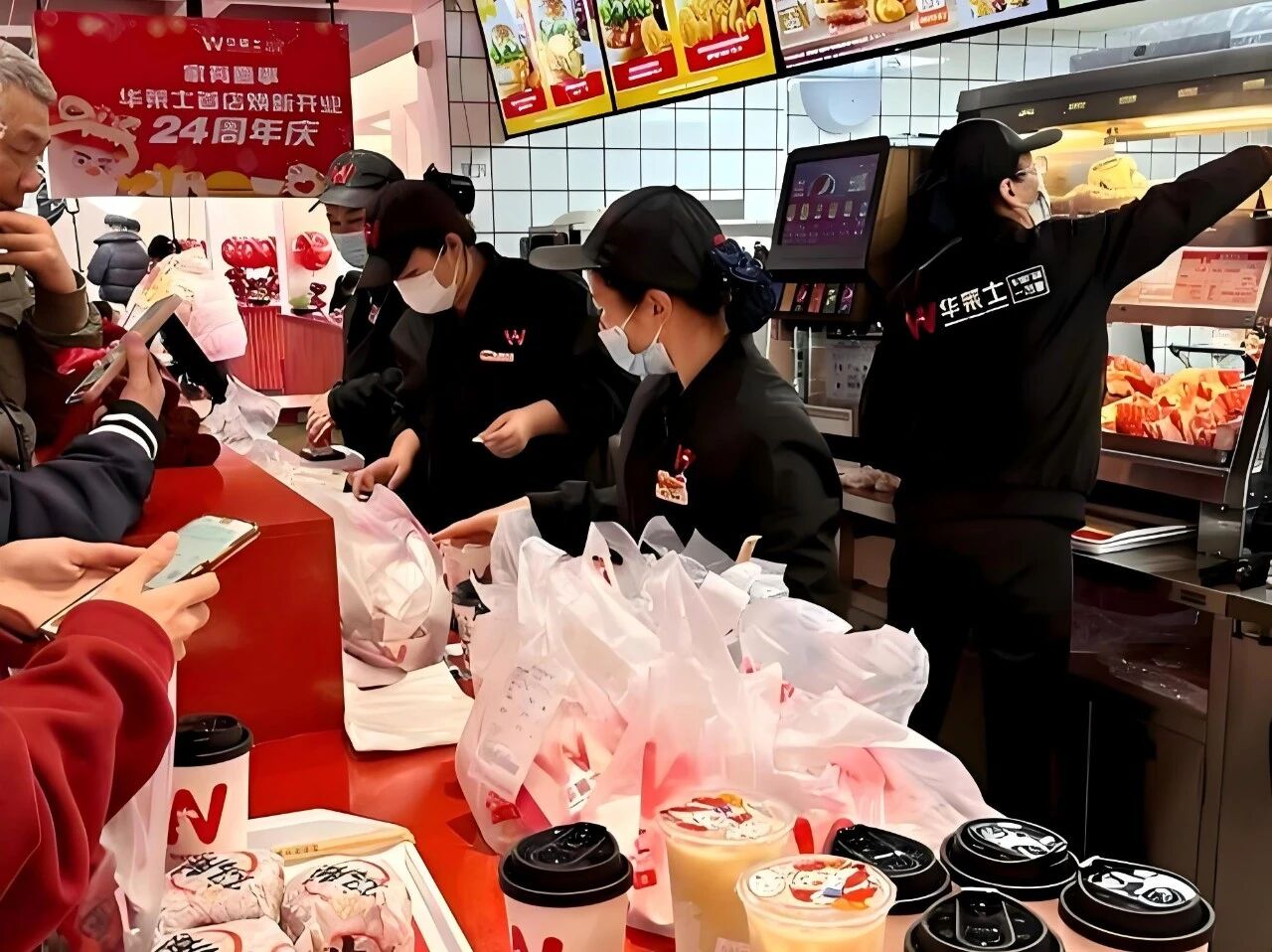 店长和员工都是股东,每个人自然像打了鸡血一样,拼命控制成本,玩命提升效率。这种强绑定的利益机制,让华莱士在没有花一分钱广告费的情况下,像野草一样在三四线城市和县城疯狂生长。2023年华莱士门店突破2万家。2024年华莱士的低价策略卷到了美国,洛杉矶首店“10美元3个汉堡”的促销活动,同样让老外排起了长龙。因为便宜,有老外把菜单点了一遍。