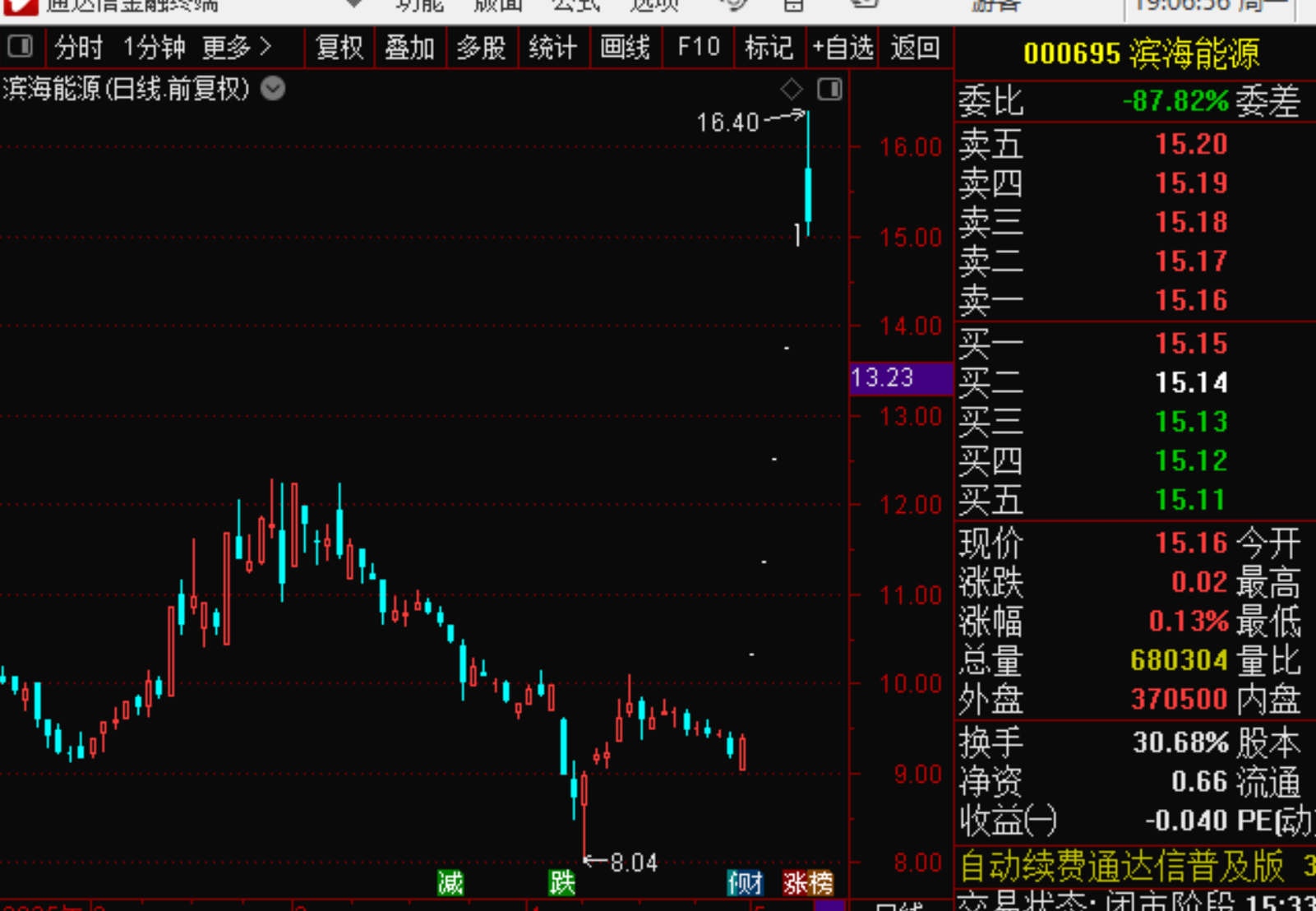 上周五空间板滨海能源今天断板,滨海能源是并购重组概念走的最远的,上周五并购重组概念大面积大面,今天滨海能源断板,并购重组概念最高标倒下。