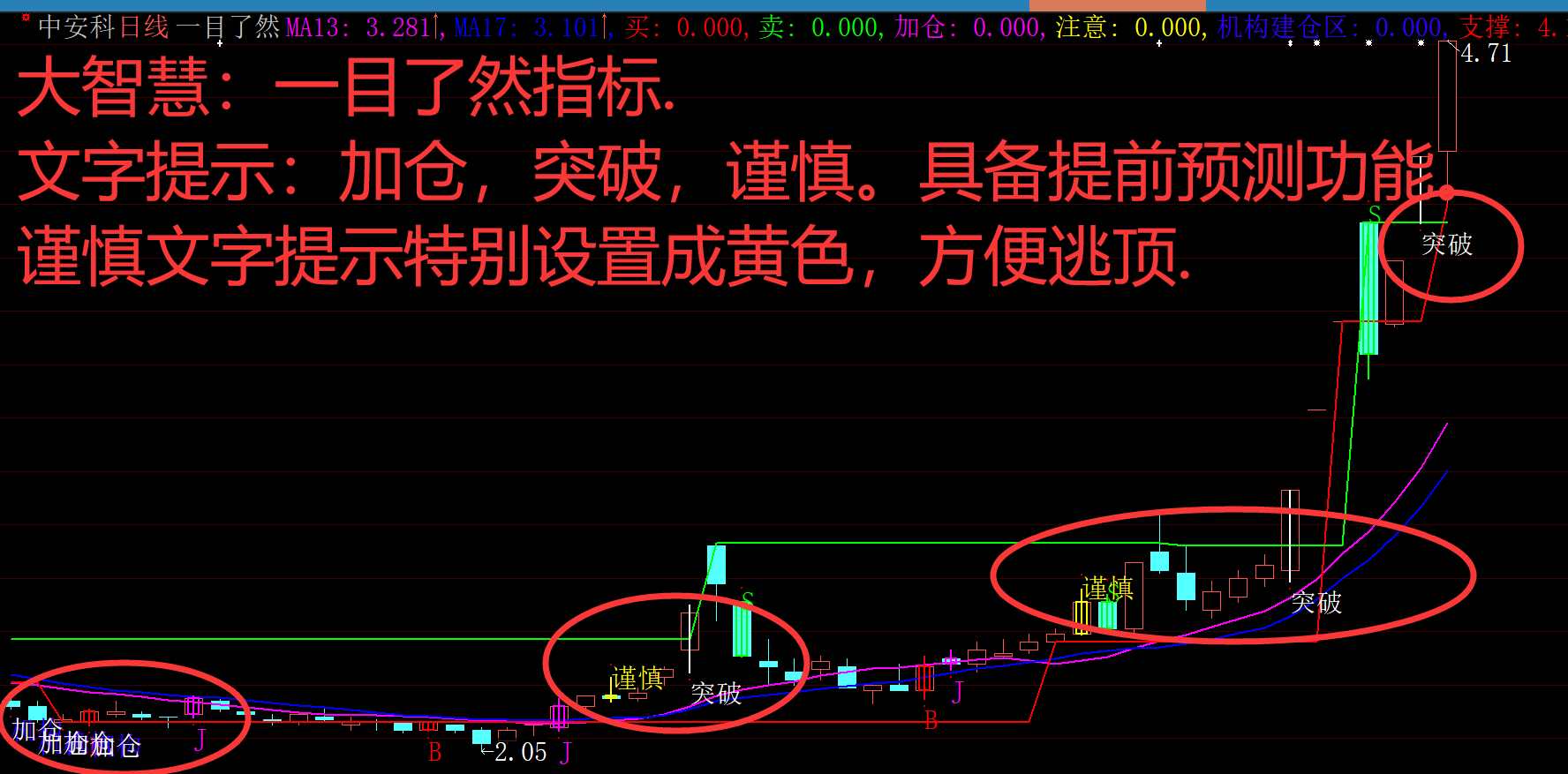 大智慧:一目了然指标.文字提示:加仓,突破,谨慎。具备提前预测功能。谨慎文字提示特别设置成黄色,方便逃顶.