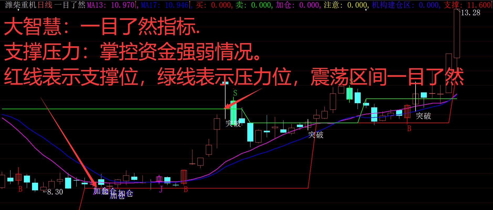 大智慧:一目了然指标.支撑压力:掌控资金强弱情况。红线表示支撑位,绿线表示压力位,震荡区间一目了然