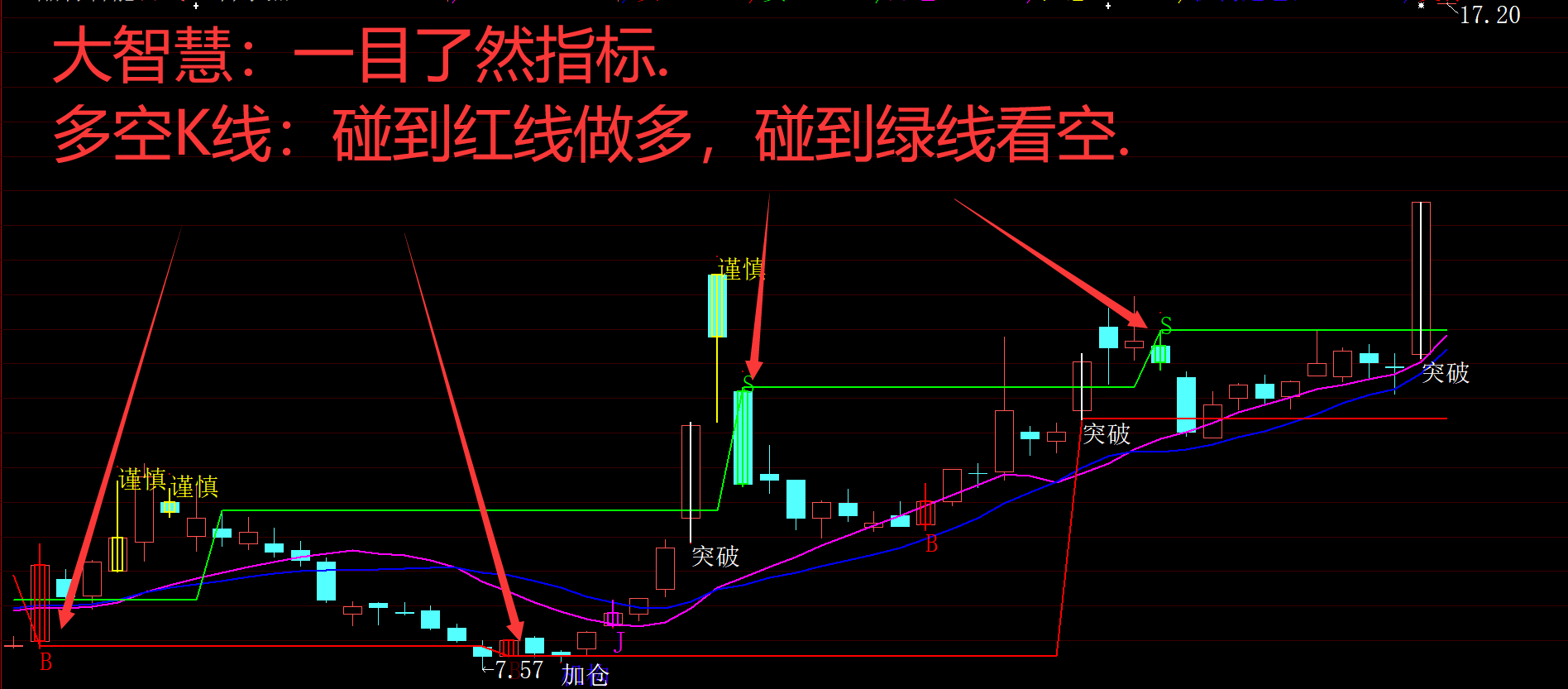 大智慧:一目了然指标.多空K线:碰到红线做多,碰到绿线看空.即使第一次使用指标的投资者也能运用自如。盘面背后多空力量博弈一目了然。