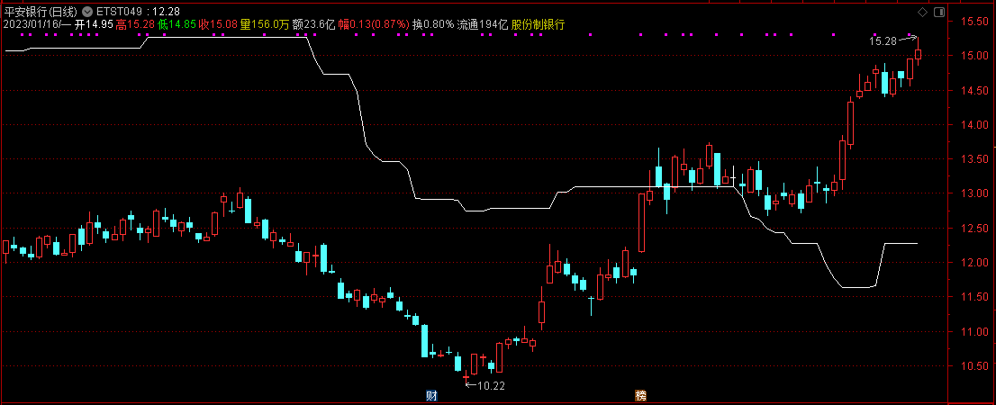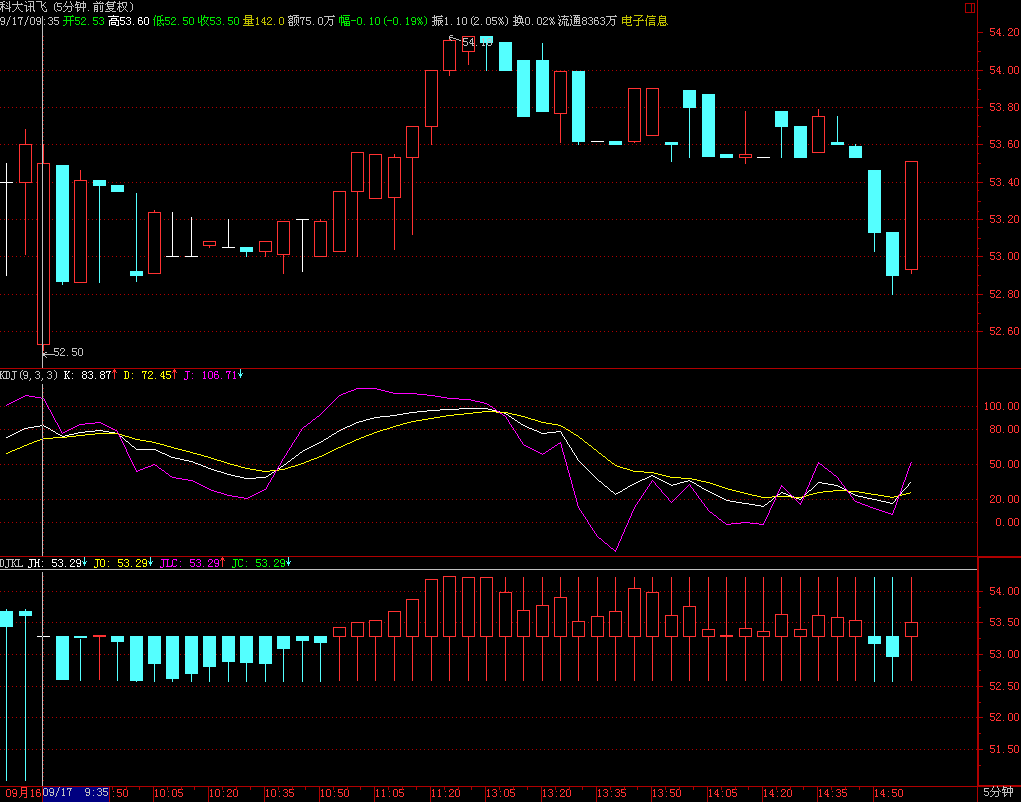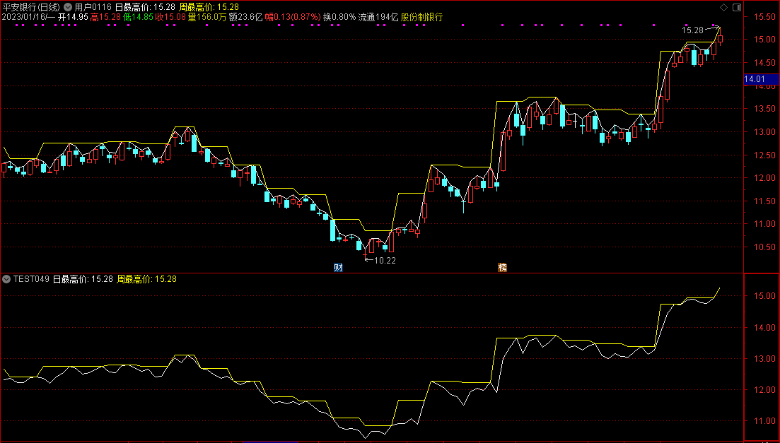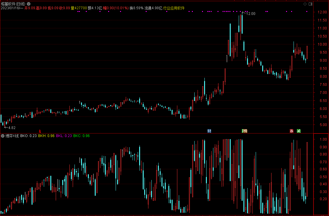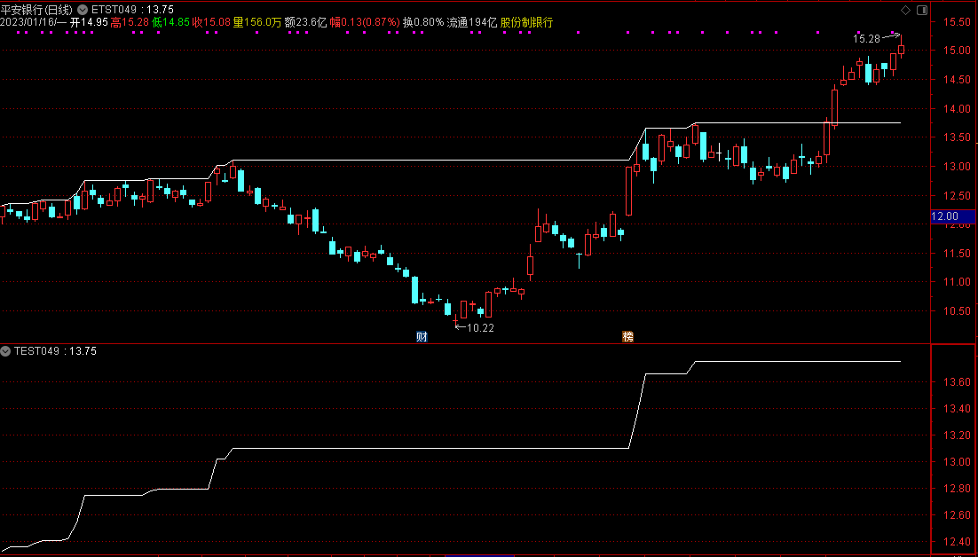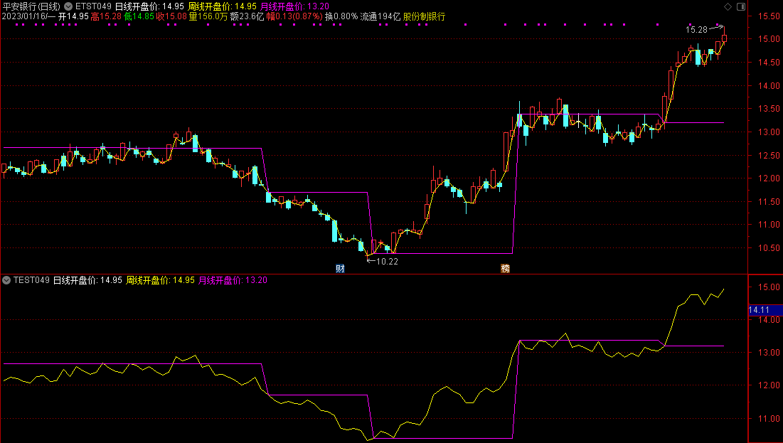 在日线周期下,引用公式2中的数据(通过引用指标设置周期的方法来获得分钟周期的数据),通过K线绘制的函数就可以画出模拟 的K线了。